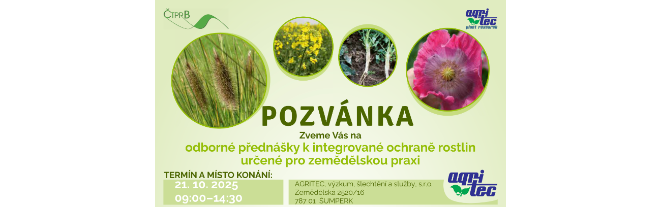 Zveme Vás na odborné přednášky k integrované ochraně rostlin určené pro zemědělskou praxi, které proběhnou 21. 10. 2025 ve velkém sále firmy Agritec v Šumperku.